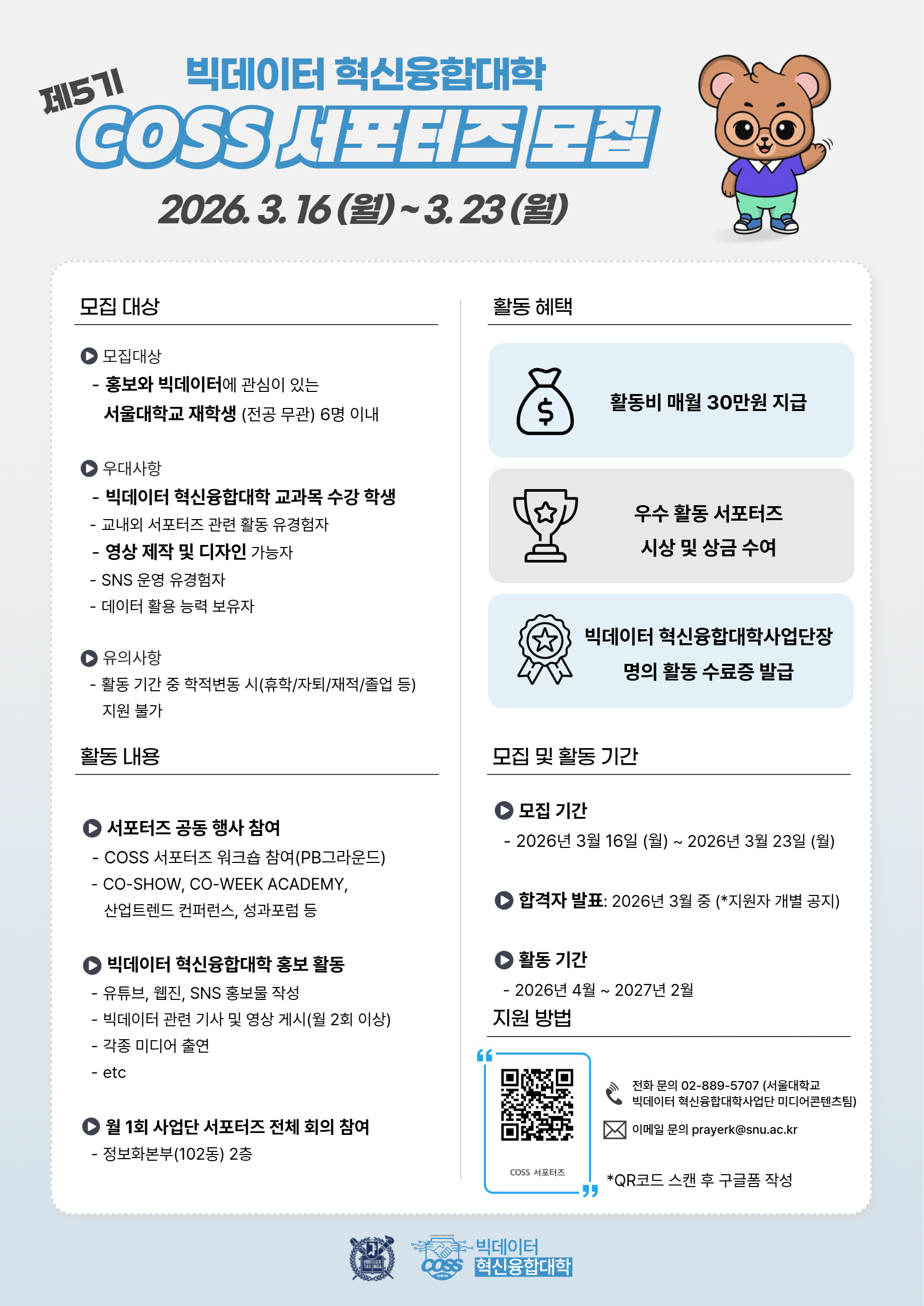 [서울대학교] 서울대학교 빅데이터혁신융합대학 개발팀 AI 프롬프트 라이브러리 구축 인턴 모집 공고
