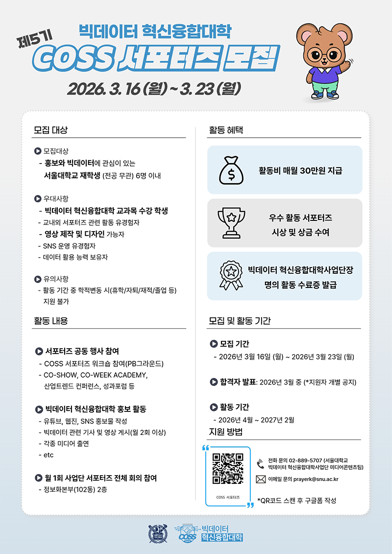 빅데이터 혁신융합대학사업단과 올해 함께할 제5기 COSS 서포터즈를 모집합니다.